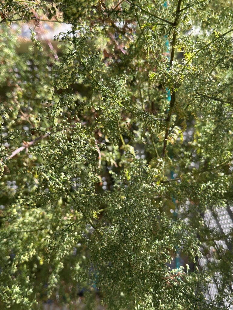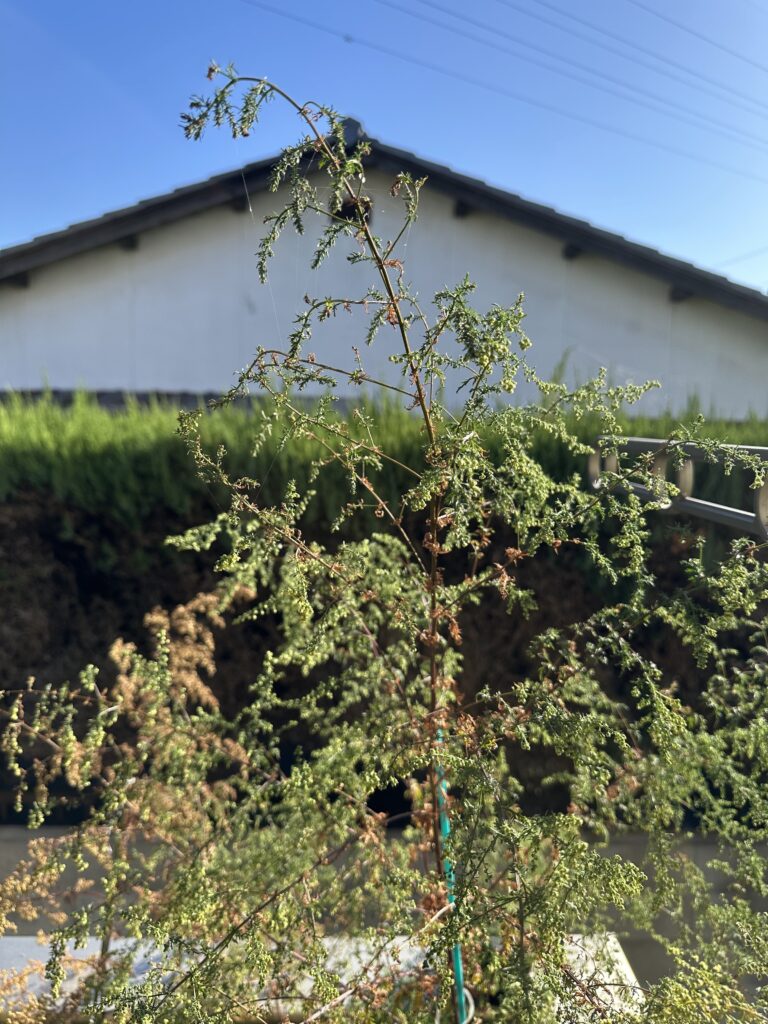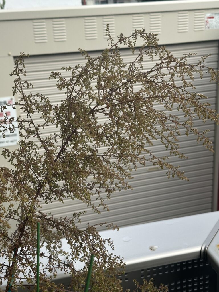9月上旬から11月上旬まで部屋の中に入れておいた高さ2m超えのクソニンジン。ようやく花が咲き始めた。花は満開ではないが小さいが茎の色は急速に茶色くなってきている。